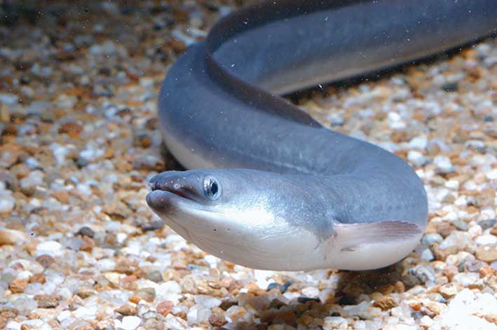 川にすむイメージが強いかもしれませんが、当館では相模湾ゾーンの岩礁水槽でコブダイや海藻と共に飼育しています。