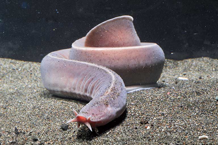ウナギのような細長い体と退化した目、そして独特な形の口をもつ現在展示中のヌタウナギ。