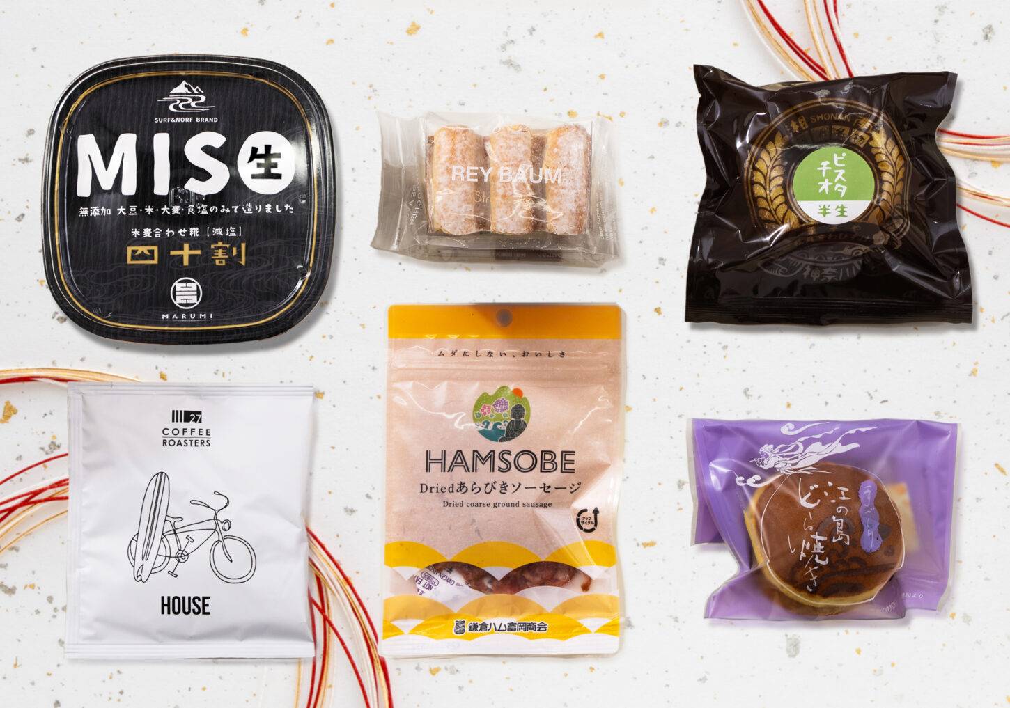 「丸三 SURF&NORF BRAND」の無添加みそや辻堂の人気店「27 COFFEE ROASTERS」のドリップコーヒーの他、和・洋スイーツ、鎌倉土産の新定番「HAMSOBE」など、湘南える編集部員"めいさ"がセレクトした商品を詰め合わせにした盛りだくさんな内容です。