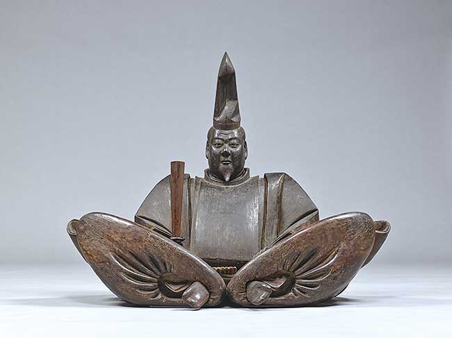 狩衣(かりぎぬ)姿で笏(しゃく)をもち、高い烏帽子(えぼし)姿、両脚を倒した威厳のある姿の像です。