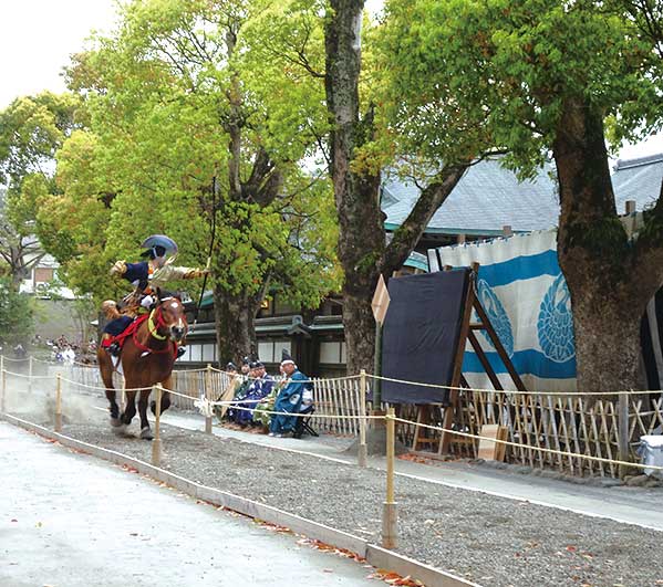 馬上の射手(いて)が、流鏑馬道に配した3つの的を狙います。